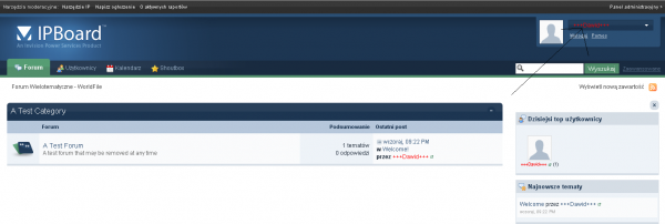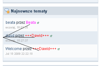 8. Jeśli chcesz uzyskać taki efekt w panelu "Najnowsze tematy" to postępuj według poniższych wskazówek: Otwórz plik hooks/boardIndexRecentTopics_xxxx Gdzie xxxx są to przypadkowe liczby. Znajdź: 'select' => 'm.members_display_name, m.members_seo_name', Zamień na: 'select' => 'm.members_display_name, m.members_seo_name,m.member_group_id', Zapisz i wyślij na serwer. Wejdź w --->ACP--->Wygląd--->Wybierz skin--->Zarządzaj szablonami i CSS-em--->Strona główna--->hookRecentTopics Znajdź: <a class="url fn" href="{parse url="showuser={$r['starter_id']}" template="showuser" seotitle="{$r['members_seo_name']}" base="public"}" title='{$this->lang->words['view_profile']}'>{$r['members_display_name']}</a> Zamień na: <a class="url fn" href="{parse url="showuser={$r['starter_id']}" template="showuser" seotitle="{$r['members_seo_name']}" base="public"}" title='{$this->lang->words['view_profile']}'>{IPSLib::makeNameFormatted($r['members_display_name'], $r['member_group_id'])}</a> Gotowe!