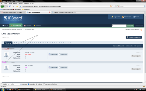 12. Witam, Tym razem pokolorujemy nick na liście użytkowników (dlatego, że mod T30 Group Format nie koloruje tam nicków). Przed operacją: ACP--->Wygląd--->Wybierz Skin--->Zarządzaj szablonami i CSS-em--->Lista Użytkowników--->member_list_show Znajdź: <h3 class='bar'><a href='{parse url="showuser={$member['member_id']}" template="showuser" seotitle="{$member['members_seo_name']}" base="public"}' title='{$this->lang->words['view_profile']}'>{$member['members_display_name']}</a>{parse template="user_popup" group="global" params="$member['member_id'], $member['members_seo_name']"}</h3> Zamień na: <h3 class='bar'><a href='{parse url="showuser={$member['member_id']}" template="showuser" seotitle="{$member['members_seo_name']}" base="public"}' title='{$this->lang->words['view_profile']}'>{IPSLib::makeNameFormatted($member['members_display_name'],$member['member_group_id'] )}</a>{parse template="user_popup" group="global" params="$member['member_id'], $member['members_seo_name']"}</h3> Tutorial dla forum.invisionize.pl