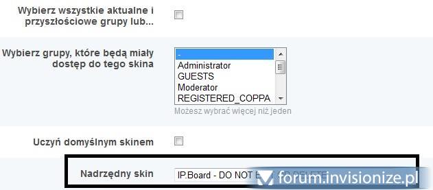 1. Witam, znalazłem rozwiązanie i chciałbym zostawić je potomnym. Otóż każdy dodatkowy skin musi mieć w ustawieniach określony skin nadrzędny: wtedy pojawi się lista wyboru u dołu forum. Oczywiście skin musi być widoczny dla określonych grup użytkowników by go widzieli. Proszę temat zamknąć i dziękuję za pomoc.