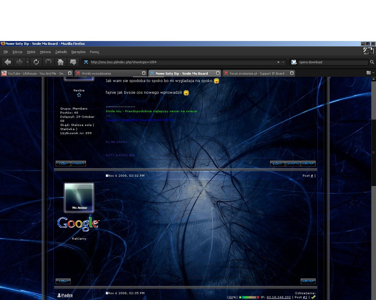 Mam mały problem z google botem mianowicie nie wyświetla reklam w przeglądarec Mozilla Firefox , a jest to najczęściej używana przeglądarka przez użytkowników mojego forum . W IE i Operze problem nie występuje . W załączniki Screen z wyglądem reklamy w Mozilli