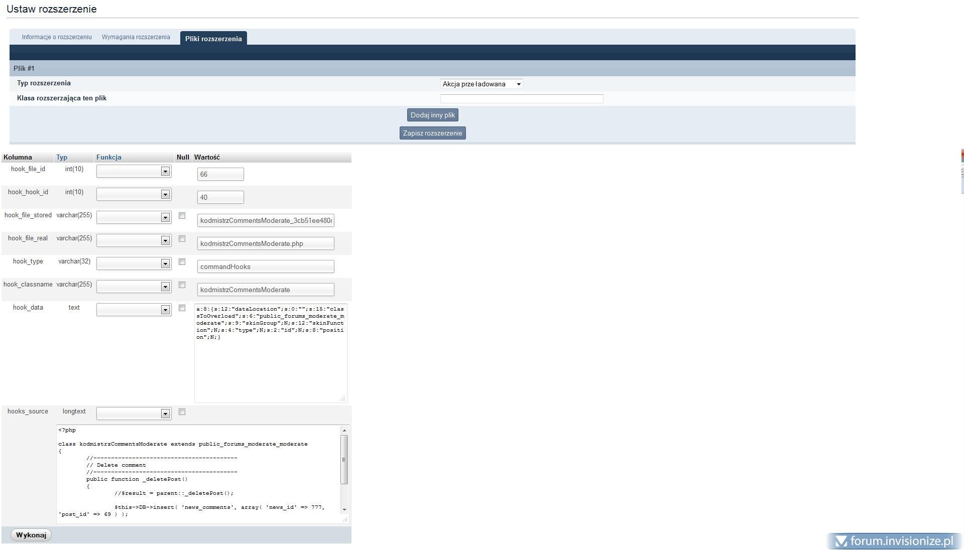Ok, zadziałało bardzo dziękuję! :-) Jeszcze ostatnia sprawa. Tym razem nic się nie dzieje jak zrobię takiego hooka: <?xml version="1.0" encoding="utf-8"?> <hookexport> <hookdata> <config> <hook_name>Kodmistrz Comments Moderate</hook_name> <hook_desc>Obsługa komentarzy w Kodmistrz CMS</hook_desc> <hook_author>Patryk Stepniewski</hook_author> <hook_email>[email protected]</hook_email> <hook_website>http://www.kodmistrz.pl/</hook_website> <hook_update_check/> <hook_requirements><![CDATA[a:4:{s:20:"hook_ipb_version_min";i:0;s:20:"hook_ipb_version_max";i:0;s:20:"hook_php_version_min";s:1:"0";s:20:"hook_php_version_max";s:1:"0";}]]></hook_requirements> <hook_version_human>1.0</hook_version_human> <hook_version_long>10000</hook_version_long> <hook_extra_data/> <hook_key>kodmistrz_comments_moderate</hook_key> </config> </hookdata> <hookfiles> <file> <hook_file_real>kodmistrzCommentsModerate.php</hook_file_real> <hook_type>commandHooks</hook_type> <hook_classname>kodmistrzCommentsModerate</hook_classname> <hook_data><![CDATA[a:8:{s:12:"dataLocation";s:0:"";s:14:"libApplication";s:0:"";s:15:"classToOverload";s:6:"public_forums_moderate_moderate";s:9:"skinGroup";N;s:12:"skinFunction";N;s:4:"type";N;s:2:"id";N;s:8:"position";N;}]]></hook_data> <hooks_source><![CDATA[<?php class kodmistrzCommentsModerate extends public_forums_moderate_moderate { //----------------------------------------- // Delete comment //----------------------------------------- public function _deletePost() { $result = parent::_deletePost(); $this->DB->insert( 'news_comments', array( 'news_id' => 777, 'post_id' => 69 ) ); return $result; } } ]]> </hooks_source> </file> </hookfiles> <hookextras_settings/> <hookextras_language/> <hookextras_modules/> <hookextras_help/> <hookextras_templates/> <hookextras_css/> <hookextras_tasks/> <hookextras_database_create/> <hookextras_database_alter/> <hookextras_database_update/> <hookextras_database_insert/> </hookexport> -