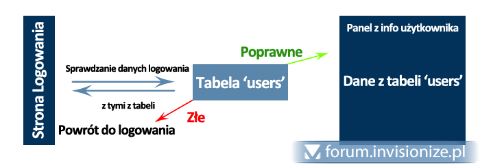 Witajcie. Potrzebował bym małej porady dotyczącej php oraz mysql. Otóż chciałem zrobić taki skrypt w którym wyświetlane by były dane z tabeli MySQL w zależności od nazwy zalogowanego użytkownika. Czyli: na początku mamy stronę logowania gdzie wpisujemy login i hasło pobierane z tabeli 'users'. Następnie, po pomyślnym zalogowaniu wyświetlała by się strona z danymi użytkownika który właśnie się zalogował. Oczywiście te dane także będą pobierane z tabeli 'users'. Teraz przedstawię to za pomocą obrazka (dla tych nierozumiejących do końca moich wypocin ) Mam nadzieję że teraz wiecie o co mi chodzi