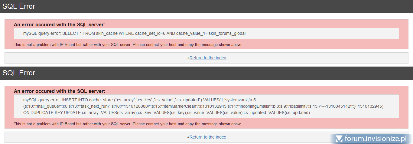 Ten sam błąd, tylko że został ten pierwszy mySQL query error: SELECT * FROM skin_cache WHERE cache_set_id=6 AND cache_value_1='skin_forums_global'
