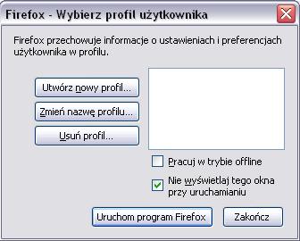 9. Jeszcze możesz utworzyć nowy profil taką metodą, wpisz w opcji Uruchom.... (lub skrót klawiszowy Flaga+R) komendę firefox -p. Uruchomi Ci się okienko z wyborem profili, do Firefoxa, coś takiego : i w tym okienku kliknij na opcję Utwórz nowy profil...