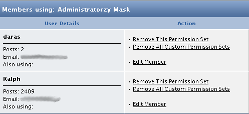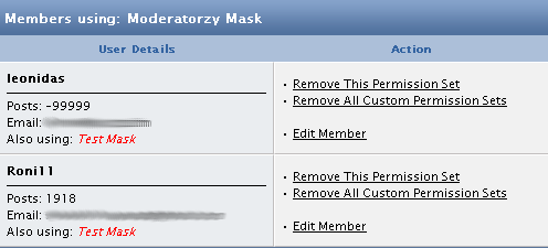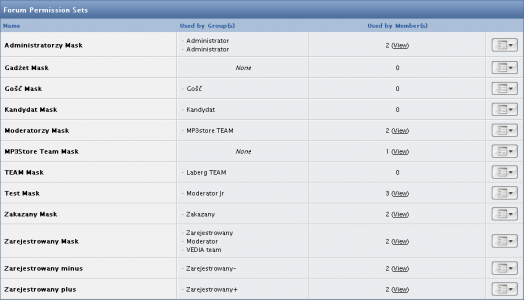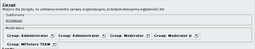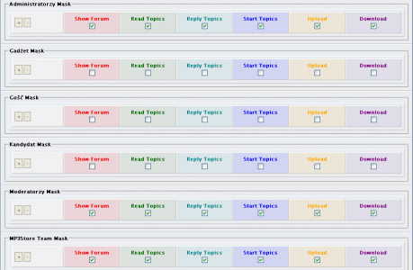 Witam, mam pewien problem z forum, które administruję. Nie jestem nie wiadomo jakim guru jeśli chodzi o IPB i nie mam też dostępu do FTP (w razie czego będę męczył drugą osobę, która ma). Chodzi mi o to, że chciałem stworzyć dział "Zarząd", do którego wgląd miałyby tylko niektóre grupy. Na pierwszym screenie widać jak ustawione są opcje moderatorów dla działu (są dwie grupy Administrator, ponieważ pierwsza to root admini, a druga to ja), natomiast na drugim screenie zezwolenia. Junior Moderator korzysta z maski Moderator, a ja korzystam z maski Administrator, więc wszystko powinno być OK, jednak dostaję raporty od pojedynczych osób pośród moderatorów (nie junior moderatora, chociaż ten też nie widzi tego działu), że go nie widzą, podczas gdy inni moderatorzy już tak. Żadna z osób z grupy Moderator nie ma przyznanej innej maski. Czy ktoś może mi wytłumaczyć gdzie może leżeć błąd? Przyznam, że cały ten koncept masek jak i skrypt IPB jest dla mnie nowy (do tej pory nie korzystałem z IPB tylko vB), więc proszę o wyrozumiałość. Pozdrawiam i z góry dziękuję za pomoc.