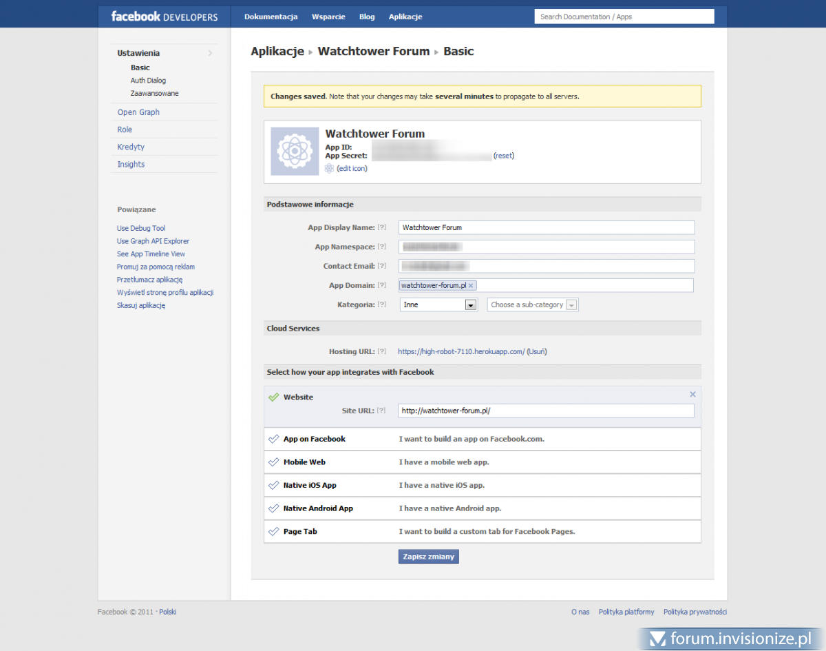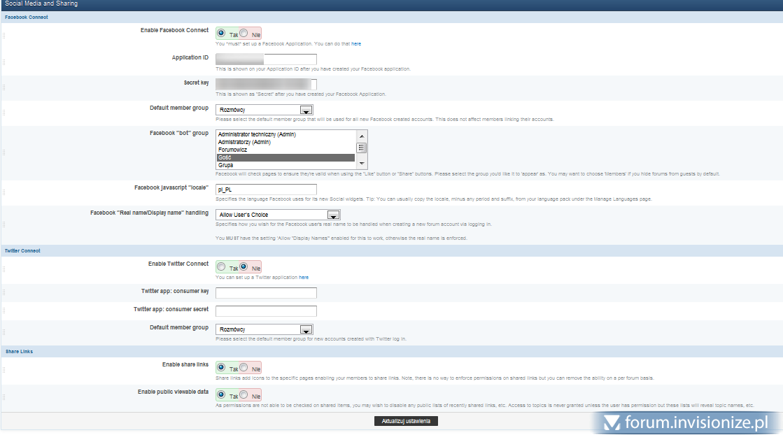 Zauważyłem, że spora grupa nowych użytkowników ma problem z integracją facebook'a z forum. Co prawda na invisionpower znajduje się już taki poradnik, ale jest on stary i nieaktualny. Po założeniu fanpage naszej strony na facebook'u musimy stworzyć dla niej odpowiednią aplikacje. Klikamy w ten link Klikamy "Utwórz aplikację" App Display Name: np. invisionize (wpisujemy nazwę aplikacji) App Namespace: pozostawiamy puste Po wypełnieniu pola klikamy Kontynuuj i przepisujemy kod captcha Po przepisaniu kodu klikamy wyślij, po kliknięciu powinniśmy zostać przeniesieni na taką stronę. Gratulacje właśnie otrzymaliśmy własne App ID (zaznaczone kolorem czerwonym) oraz App Secret (zaznaczone kolorem zielonym) Przechodzimy trochę niżej i mamy: Website - rozwijamy i wpisujemy url naszej witryny (np. http://twojeforum.pl) Resztę zostawiamy w spokoju, klikamy Zapisz zmiany. Następnie przechodzimy do zakładki Zaawansowane i w polu Deauthorize Callback podajemy adres forum na końcu którego dodajemy /interface/facebook/index.php czyli np: http://nazwa-forum.pl/interface/facebook/index.php I ponownie naciskamy przycisk Zapisz zmiany. Teraz czas na konfiguracje naszego forum. ACP -> Settings -> Social Media and Sharing Enable Facebook Connect: tak Application ID: kopiujemy wygenerowany kod, z facebook'a (obrazek nr.2 czerwona kropka) Secret key: kopiujemy wygenerowany kod, z facebook'a (obrazek nr.2 zielona kropka) Facebook javascript "locale": pl_PL Klikamy aktualizuj ustawienia. Wszystko gotowe! Teraz sprawdź czy wszystko działa poprawnie. Jak to działa można sprawdzić tutaj ******************************************************Dodane przez DawPi****************************************************** Dla nowych aplikacji powyższe rozwiązanie może nie działać. Dlatego na zakładce zaawansowane należy wyłączyć te opcje: