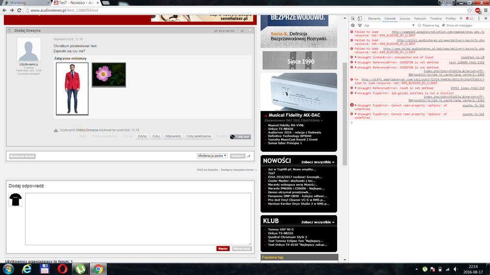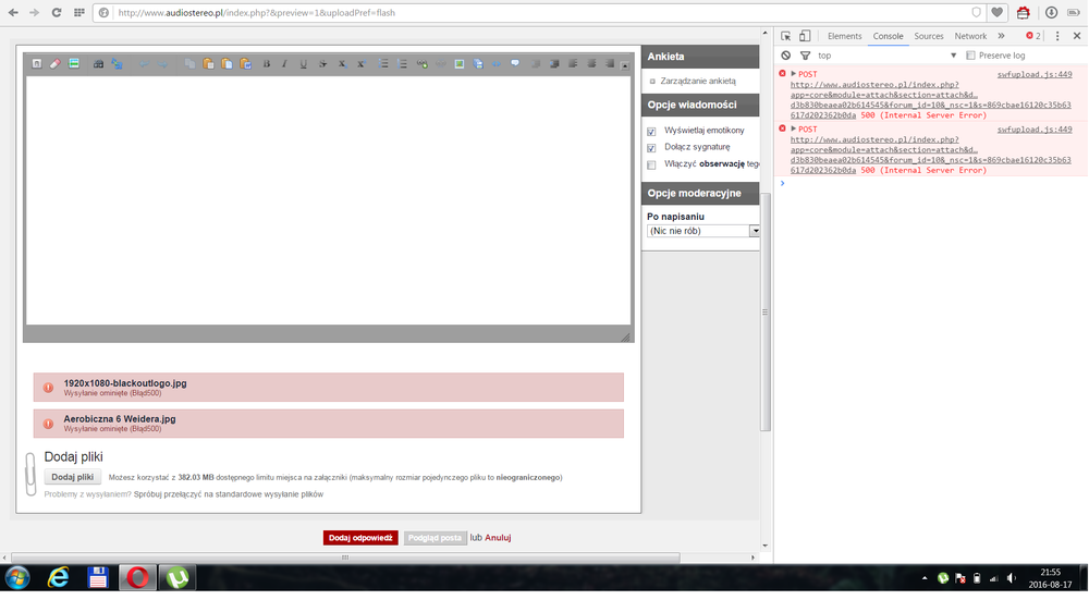Hej, Część użytkowników naszego forum zgłasza nam co jakiś czas problemy z javascriptem na forum. Nie działa im np. cytowanie selektywne, opcja odpowiedź, czy też nie ładuje się CK editor. Część nie może też dodawać załączników z dysku (mają 500ke przy próbie wysłania). Co to może być? U nas w biurze problem nie występuje, więc ciężko to zdebugować. Wczoraj wieczorem udało się odtworzyć błąd u mnie w domu na laptopie. Poniżej zrzuty ekranu z przeglądarki i konsoli. Jednak w trybie prywatnym oraz po wyczyszczeniu danych przeglądania (chrome) na tej przeglądarce u mnie też zaczęło działać. W takich przypadkach często pomaga nam czyszczenie cache po stronie serwera (opcja przebuduj cache w ipboard). Jakieś pomysły co to może być? 500ka przy próbie wysłania zdjęcia: Błąd pod chrome: