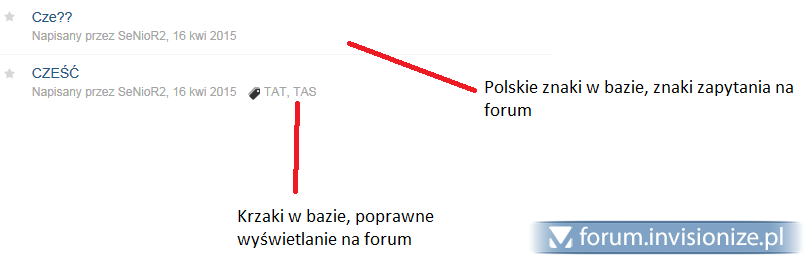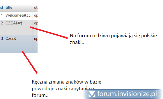 Witam, mam problem z IPB a głównie z kodowaniem znaków w bazie. Otóż w nowo utworzonej bazie która jest kodowana w UTF-8 nie wyświetlają się polskie znaki zamiast tego są krzaki. Możliwe że w IPB jest to normalne w przypadku polskich znaków, bo na forum o dziwo wszystko wyświetla się dobrze.. Dopiero po zmianie krzaków na polskie znaki, w bazie, na forum pojawiają się znaki zapytania coś w stylu "Cze??" Dla lepszego zrozumienia, przedstawiam to w formie obrazka. Sytuacja jest trochę dziwna i całkiem odwrotna do zamierzonej. Gdybym nie planował konwersji do IPB 4.0 to prawdopodobnie by mi to nie przeszkadzało. Czy jest ktoś w stanie rozwiązać problem? Pozdrawiam.