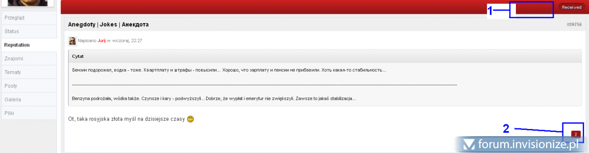 Witam, Chciałbym ukryć przycisk minusa (możliwość dania przez użytkownika ujemnego punktu reputacji w postach), gdyż i tak nie ma uprawnień do przydzielenia takiego punktu, a więc jest to dla nich "zbędny widok". Szukałem w stylu w sekcji "Widok tematu" przeglądałem wszystkie szablony lecz jedyny kod jaki tam znalazłem jest raczej od wyświetlania ilości reputacji za dany post, oraz czy reputacja ujemna jest włączona (tu chciałem kombinować ale raczej musiałbym napisać jakąś modyfikacje na to) Pytanie brzmi: czy w jakiś prosty sposób można ukryć tą grafikę? Jeśli tak to proszę jakiegoś dobrego człowieka o zademonstrowanie fragmentu kodu ze standardowego stylu, gdzie mógłbym podczepić swój warunek. Zastanawiam się w sumie czy nie zgłosić im tego w trackerze, ponieważ jest to bez sensu, nie mając uprawnień widzieć ten przycisk... Niemniej jednak prosiłbym o małe naprowadzenie jak mogę tymczasowo się z tym uporać.- 10 odpowiedzi