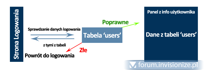 Witajcie. Potrzebował bym małej porady dotyczącej php oraz mysql. Otóż chciałem zrobić taki skrypt w którym wyświetlane by były dane z tabeli MySQL w zależności od nazwy zalogowanego użytkownika. Czyli: na początku mamy stronę logowania gdzie wpisujemy login i hasło pobierane z tabeli 'users'. Następnie, po pomyślnym zalogowaniu wyświetlała by się strona z danymi użytkownika który właśnie się zalogował. Oczywiście te dane także będą pobierane z tabeli 'users'. Teraz przedstawię to za pomocą obrazka (dla tych nierozumiejących do końca moich wypocin :P)